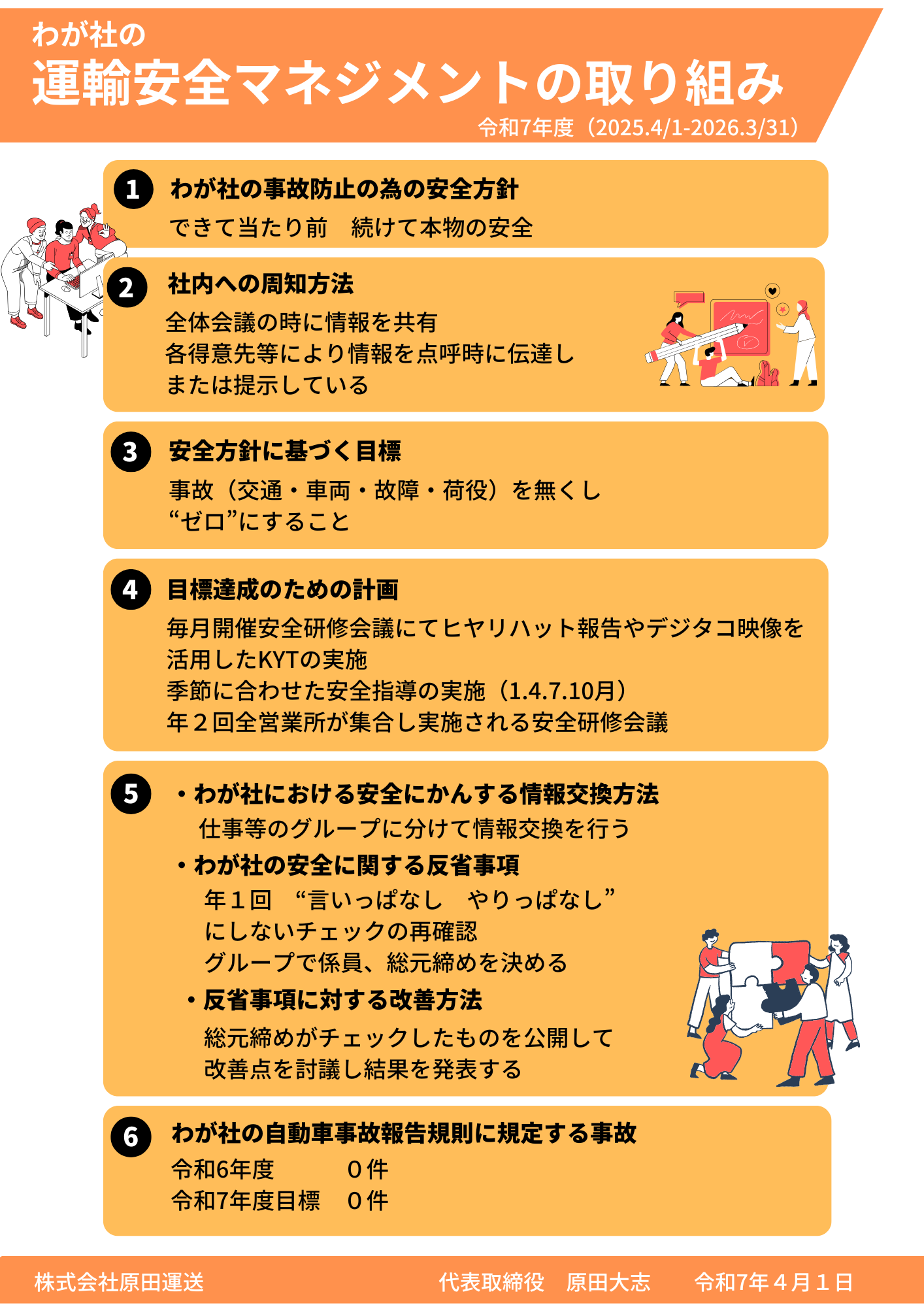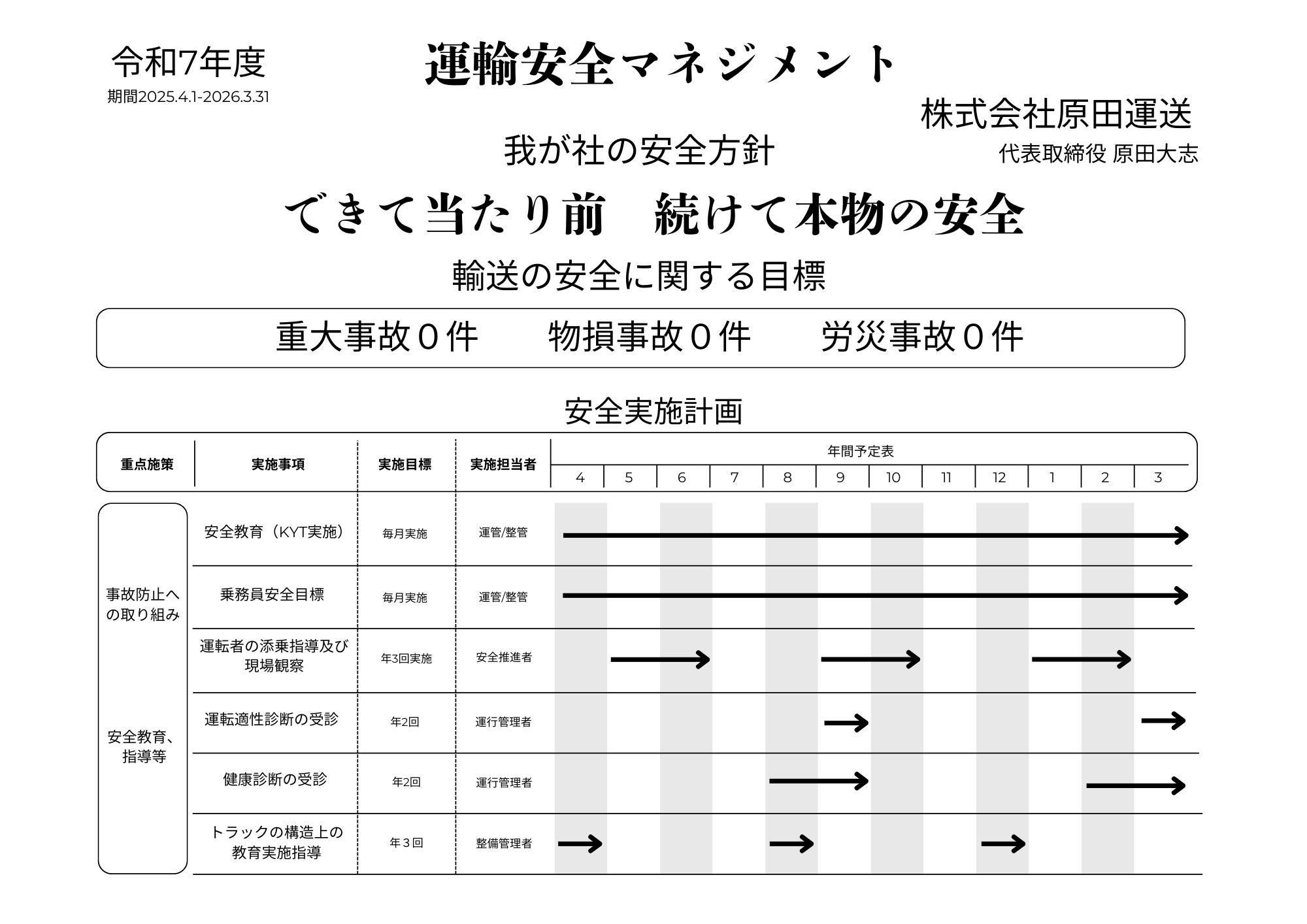 原田運送の安全戦略の基盤となるのは、1977年の導入以来、着実に当社の安全を支え続けてきた独自の「安全指導長制度」です。安全指導長は各主管支店に配属された安全対策の専門職で、日々、管下のセンターを巡回しながら、法令の遵守、個人の運転レベルの向上、交通・労災事故防止の徹底に取り組んでいます。
